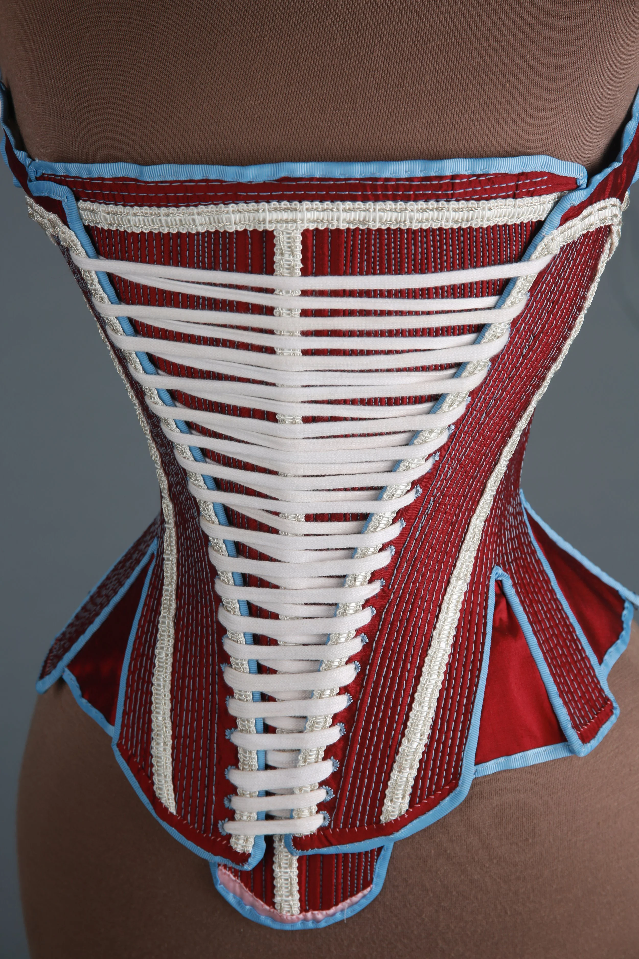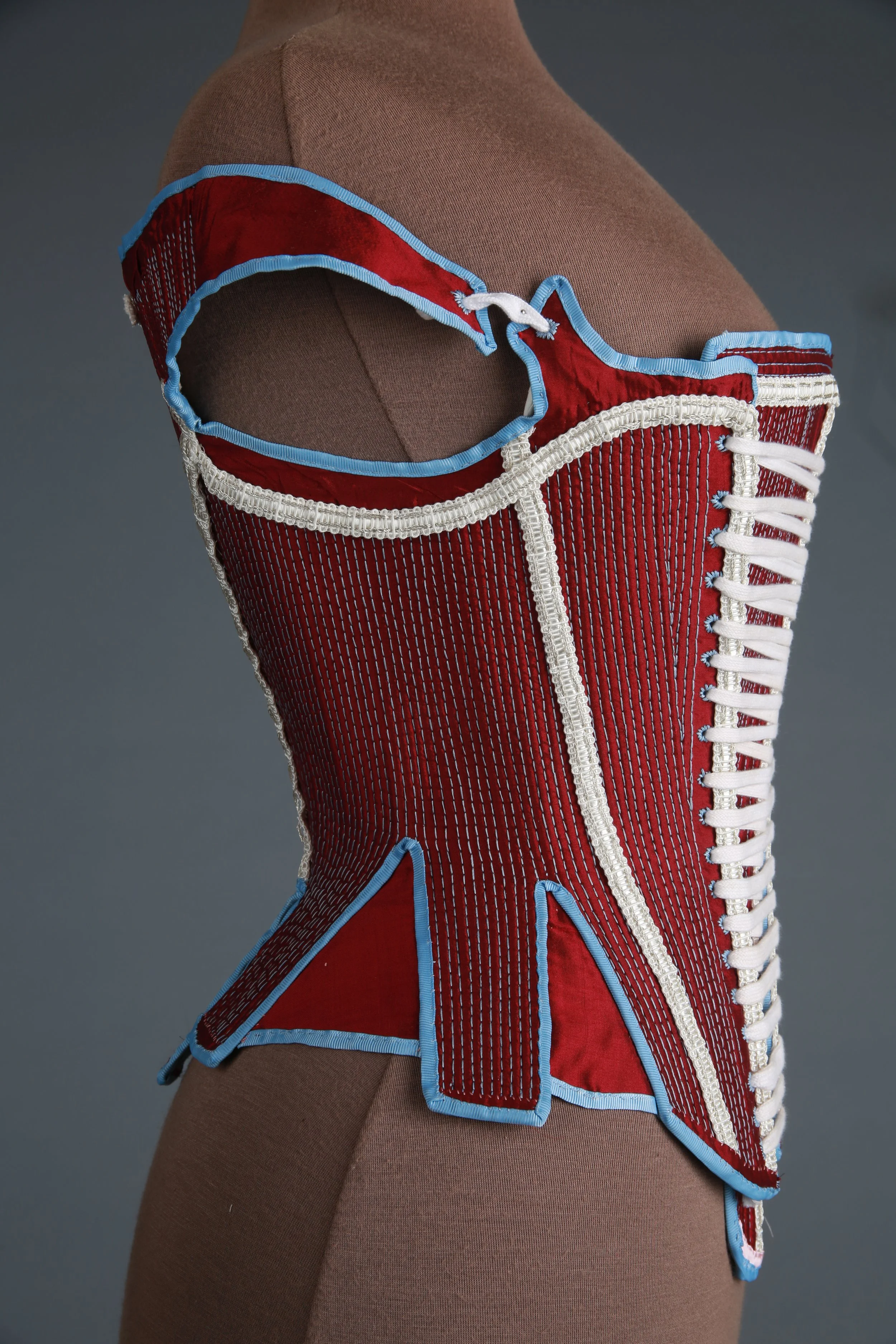 In the first module of year three, we entered The Costume Society of Great Britain’s Patterns of Fashion competition. I decided to recreate the Filmer Collection Stitched Stomacher and Stays from 1660. I used Janet Arnold’s Patterns of Fashion 5 to scale up the pattern, aiming to make the piece as close to the original as possible. I worked in crimson silk, hand-sewing everything with blue silk thread and using 2.8mm reed for the boning. I avoided shortcuts and modern changes, focusing on historical accuracy throughout.
